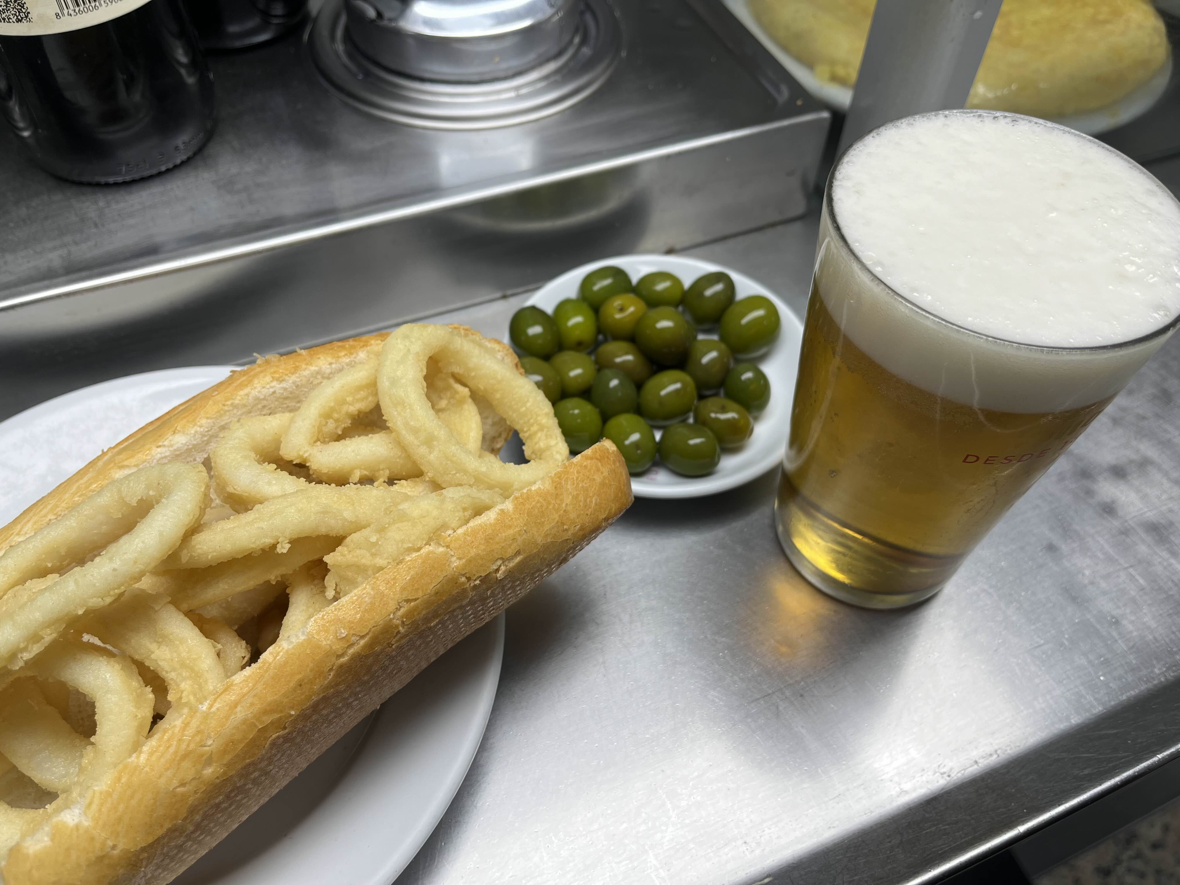 깔라마리 샌드위치를 먼저 시켰는데 이건 도저히 맥주 없이 먹기엔 아까운 맛이라서 맥주도 시켰다. 아침 11시에 상쾌하게 마시는 맥주~ 맥주를 시키니 올리브를 저만큼 주었다.
